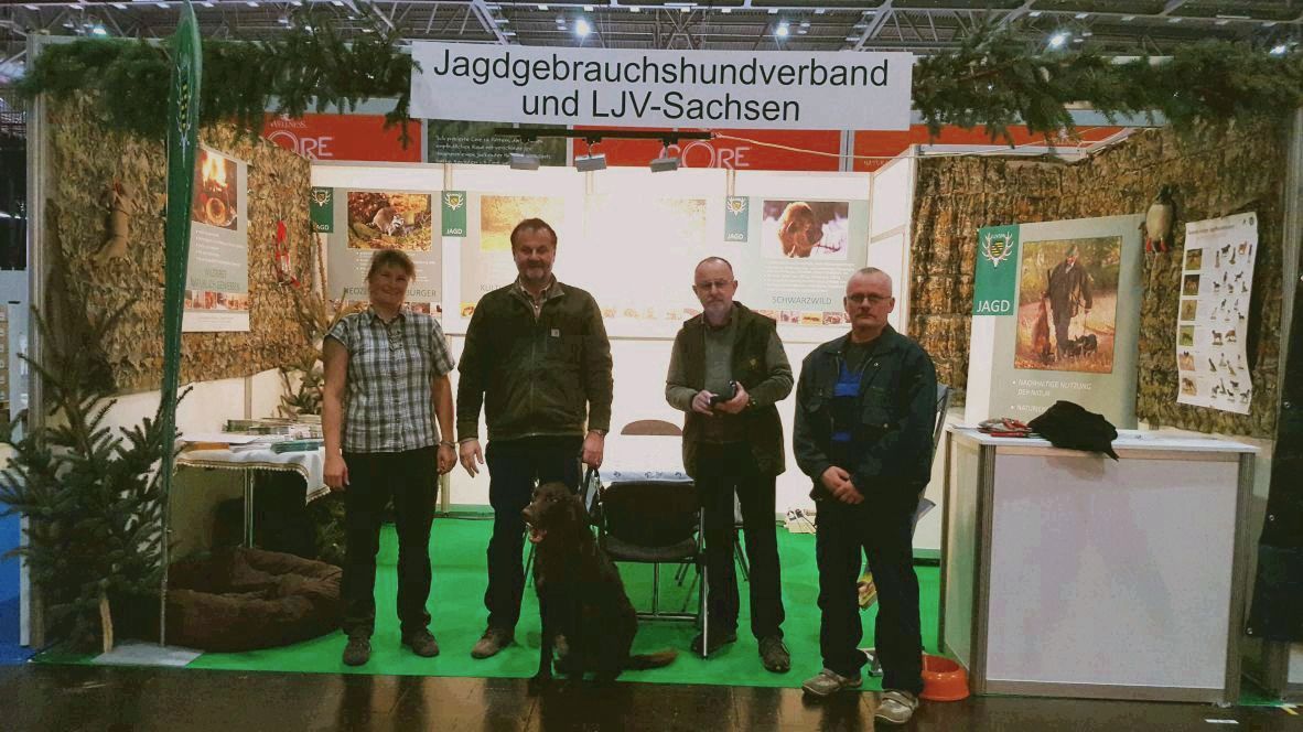 Auf dem LJV Sachsen -/JGHV- Stand können interessierte Besucher sich über Jagd und Jagdhunde informieren und vielfältiges Informationsmaterial mitnehmen.