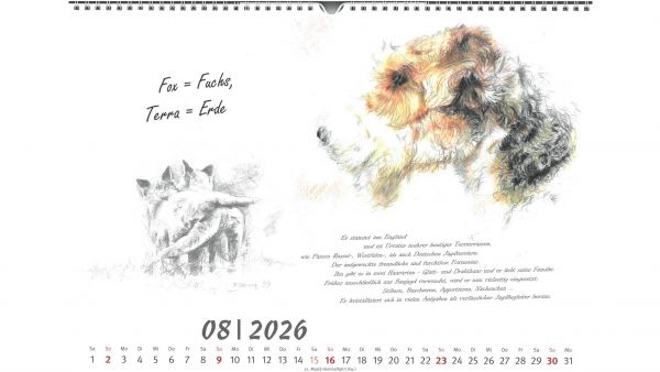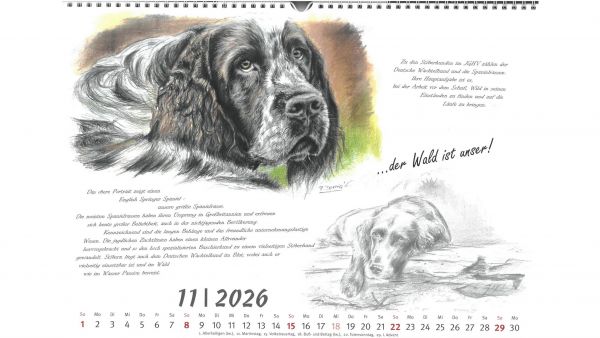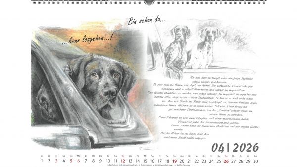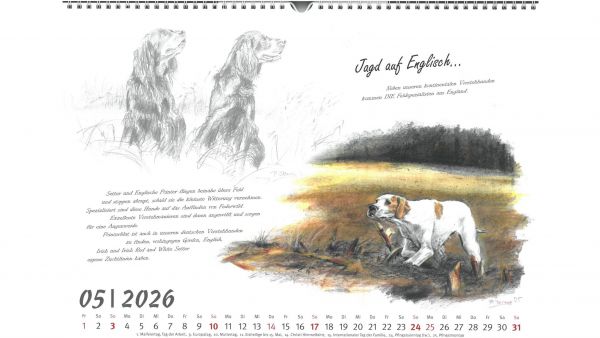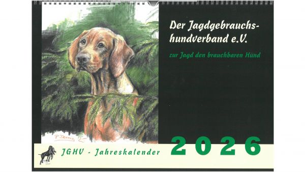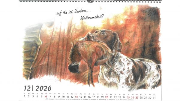 Für das Jahr 2026 bietet der Jagdgebrauchshundverband wieder einen exklusiven Kalender an. Im Querformat A3 werden im neuen Kalender verschiedene Jagdhunderassen in Szenen aus ihrem Leben bzw. Kopfstudien einzelner Rassen dargestellt. Gemalt hat die einzelnen Kalenderblätter die Stammbuchführerin des JGHV, Peggy Dornig.