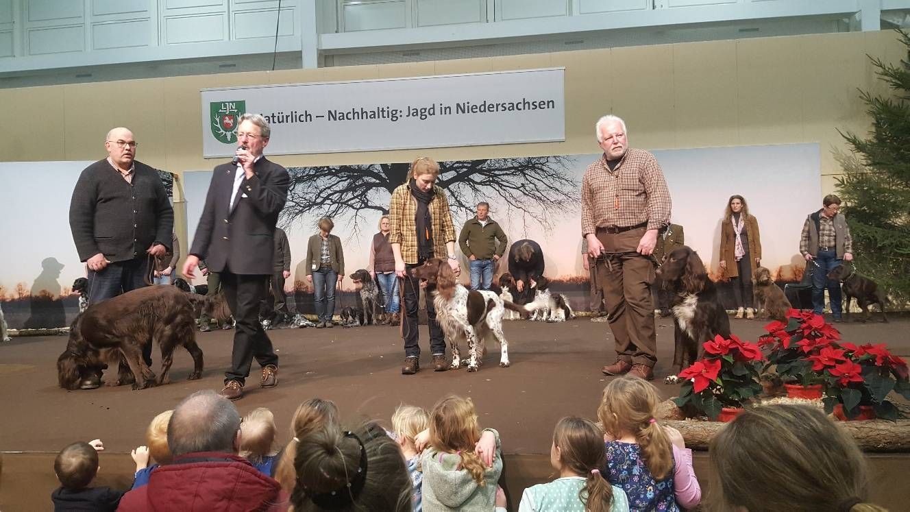 Wie immer zogen die Jagdhundevorstellungen große Besucherscharen an. Auf der Aktionsbühne der Landesjägerschaft wurden die verschiedenen inländischen und ausländischen Jagdhunderassen unter Einbeziehung der jeweiligen Einsatzbereiche und der Historie zweimal täglich von Bernd Franke präsentiert. Sogar am Sonntag kurz vor Messeschluss, um 16.00 Uhr, war das Interesse ungebrochen. Viele der Interessierten fanden keinen Sitzplatz mehr und mussten der Veranstaltung stehend folgen.