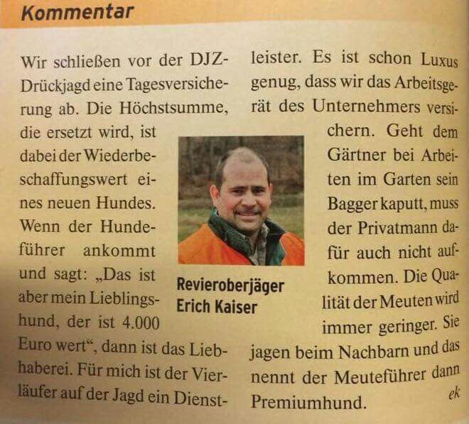der Kommentar von Revieroberjäger Erich Kaiser in der DJZ 11/17 bewegt und verunsichert viele Hundeführer. Pünktlich zur Drückjagdsaison hat er mit seinem provozierenden Beitrag viele Hundeführer verärgert. Auch wenn es unüblich ist, zu Kommentaren eine Lesermeinung zu senden, sehe ich in diesem Fall Handlungsbedarf, auch auf Grund der fachlich unpräzisen Aussagen von Herrn Kaiser.