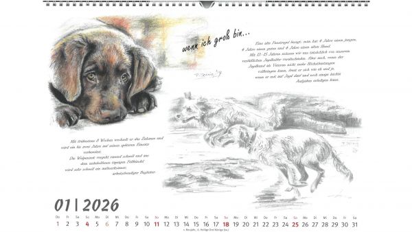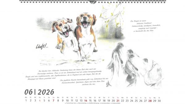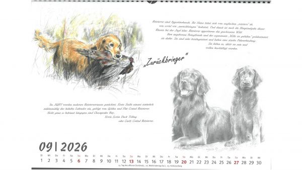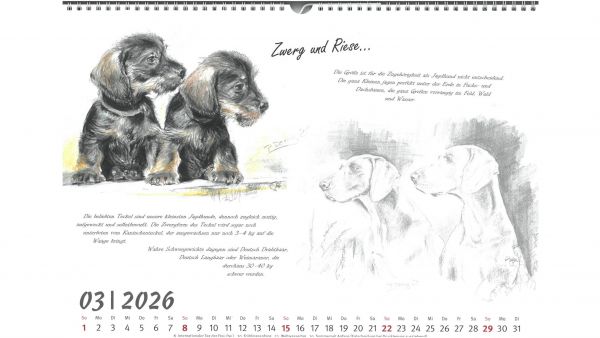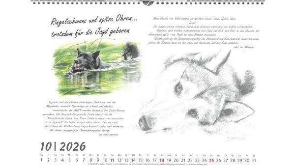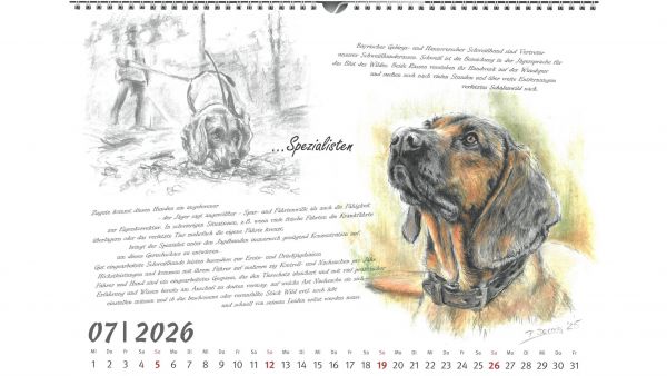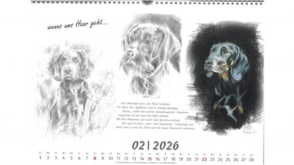 Für das Jahr 2026 bietet der Jagdgebrauchshundverband wieder einen exklusiven Kalender an. Im Querformat A3 werden im neuen Kalender verschiedene Jagdhunderassen in Szenen aus ihrem Leben bzw. Kopfstudien einzelner Rassen dargestellt. Gemalt hat die einzelnen Kalenderblätter die Stammbuchführerin des JGHV, Peggy Dornig.