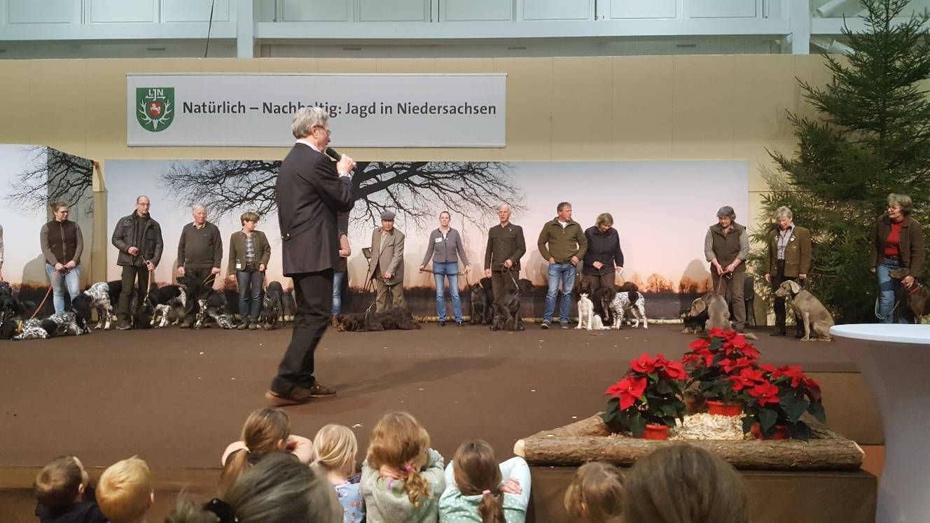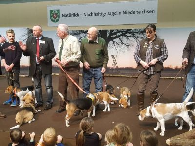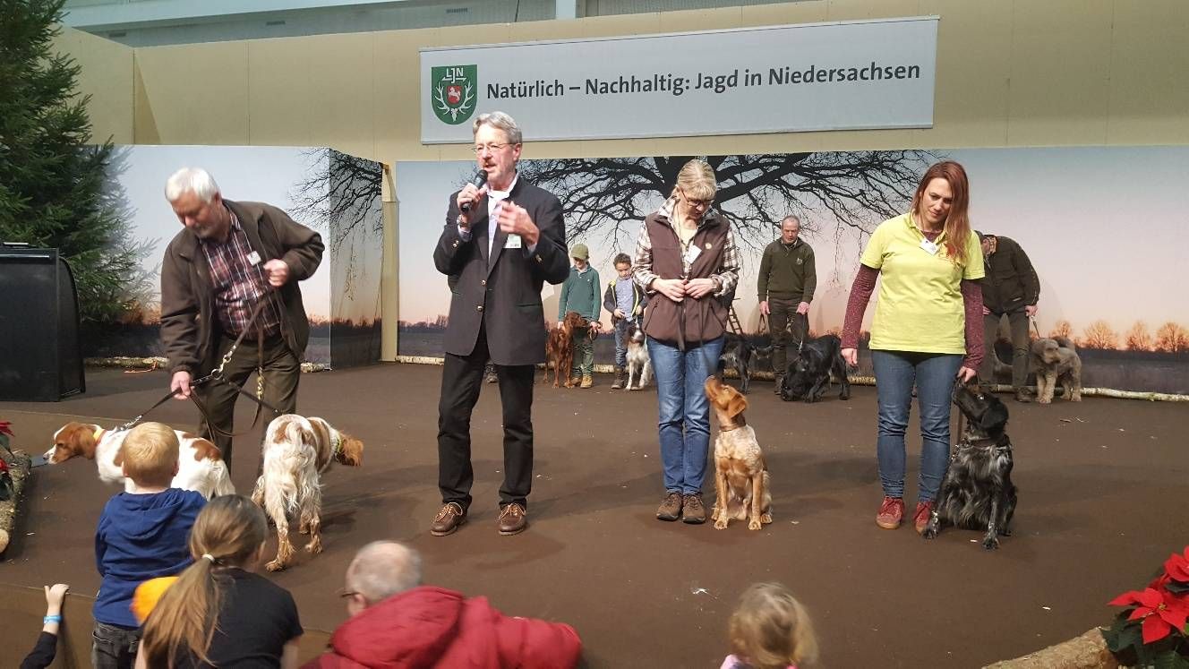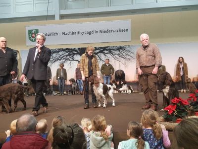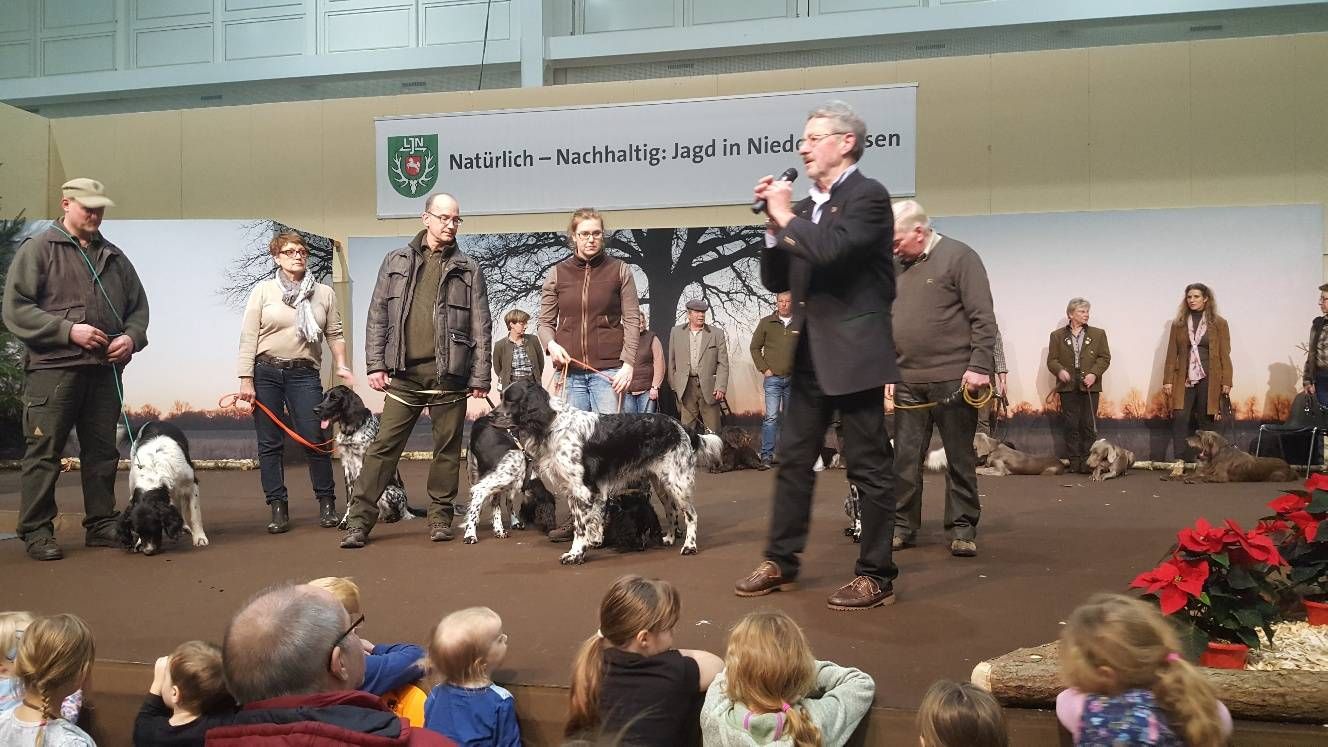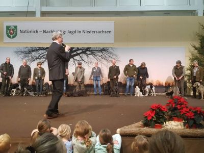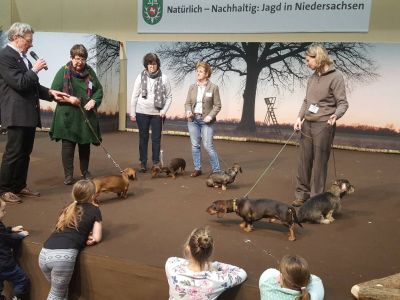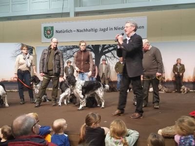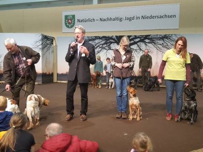 Wie immer zogen die Jagdhundevorstellungen große Besucherscharen an. Auf der Aktionsbühne der Landesjägerschaft wurden die verschiedenen inländischen und ausländischen Jagdhunderassen unter Einbeziehung der jeweiligen Einsatzbereiche und der Historie zweimal täglich von Bernd Franke präsentiert. Sogar am Sonntag kurz vor Messeschluss, um 16.00 Uhr, war das Interesse ungebrochen. Viele der Interessierten fanden keinen Sitzplatz mehr und mussten der Veranstaltung stehend folgen.