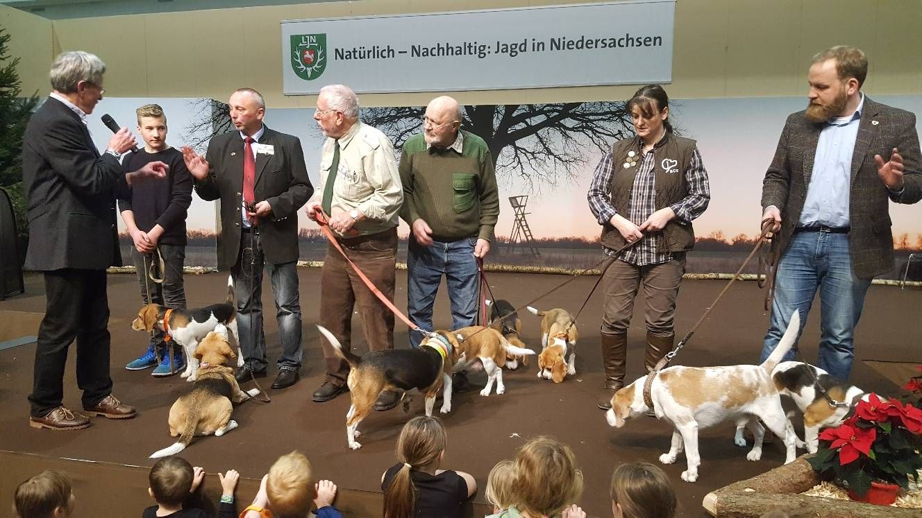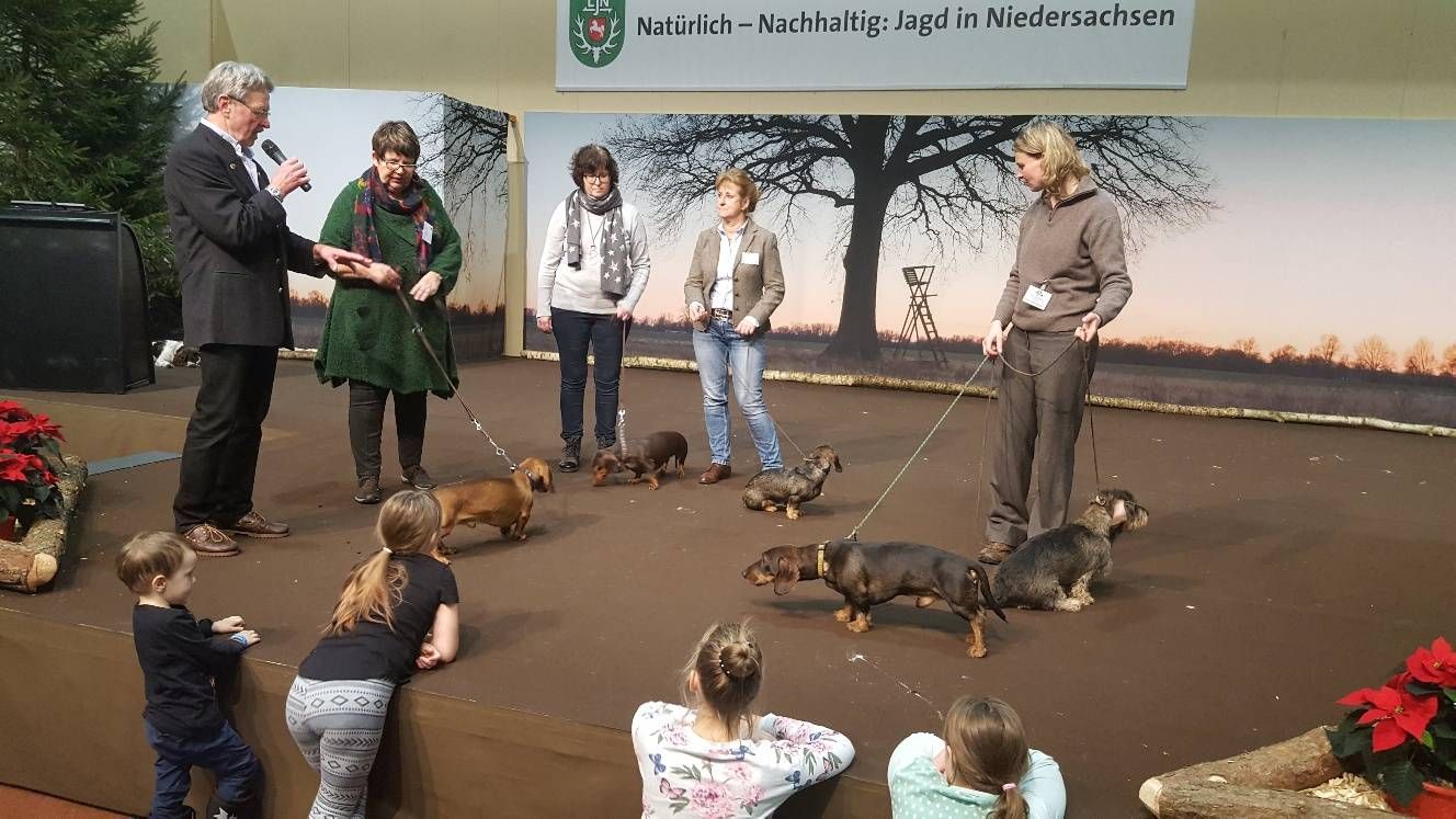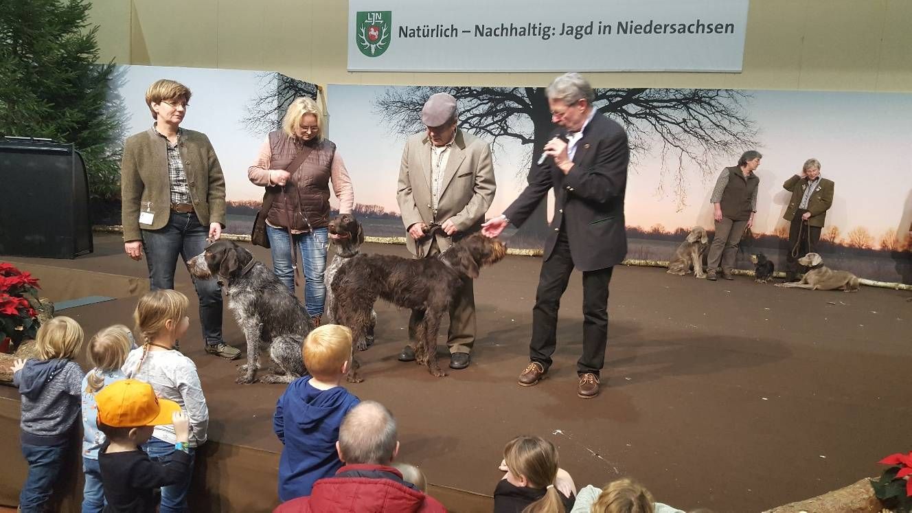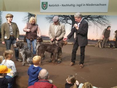 Wie immer zogen die Jagdhundevorstellungen große Besucherscharen an. Auf der Aktionsbühne der Landesjägerschaft wurden die verschiedenen inländischen und ausländischen Jagdhunderassen unter Einbeziehung der jeweiligen Einsatzbereiche und der Historie zweimal täglich von Bernd Franke präsentiert. Sogar am Sonntag kurz vor Messeschluss, um 16.00 Uhr, war das Interesse ungebrochen. Viele der Interessierten fanden keinen Sitzplatz mehr und mussten der Veranstaltung stehend folgen.