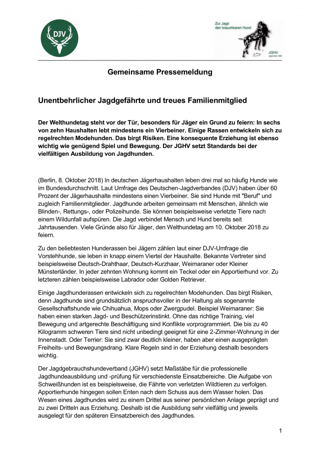 Auf dem Bonner Jägertag 2018 standen die Jagdhunde im Mittelpunkt. Der Reinisch-Westfälischer Jäger hat hierzu in seiner Oktoberausgabe Streiflichter veröffentlicht. Unser Dank geht an die Redaktion des RWJ für die Freigabe des Artikels.