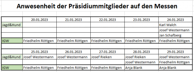Auch in diesem Jahr geben wir wieder den Hinweis, wer von der Verbandsführung an welchen Messetagen auf der Jagd & Hund anzutreffen ist. Wir sind entweder auf dem JGHV Messestand oder von dort telefonisch erreichbar. Bitte haben Sie ggf. etwas Geduld, weil sich an manchen Tagen die Termine über…