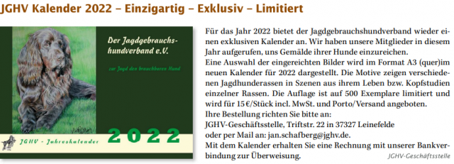 Der JGHV Kalender 2022 kann bestellt werden. Sichern Sie sich frühzeitig ein Exemplar. Die Auflage ist auf 500 Exemplare limitiert !!!!!!!